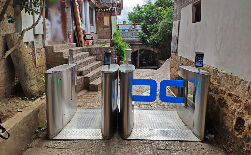 丽江古城大大小小所有出入口都要安装人脸识别户外闸机,各个出入口存在地势不平整、出入口大小不一的情况。我们派工程师到现场进行了详细的勘测,为每个出入口制定合理的闸机通道数量。地势不平且影响固定的问题,通过加装地台来解决,从而确保闸机安装稳固且处于水平位置,确保红外检测的准确性。