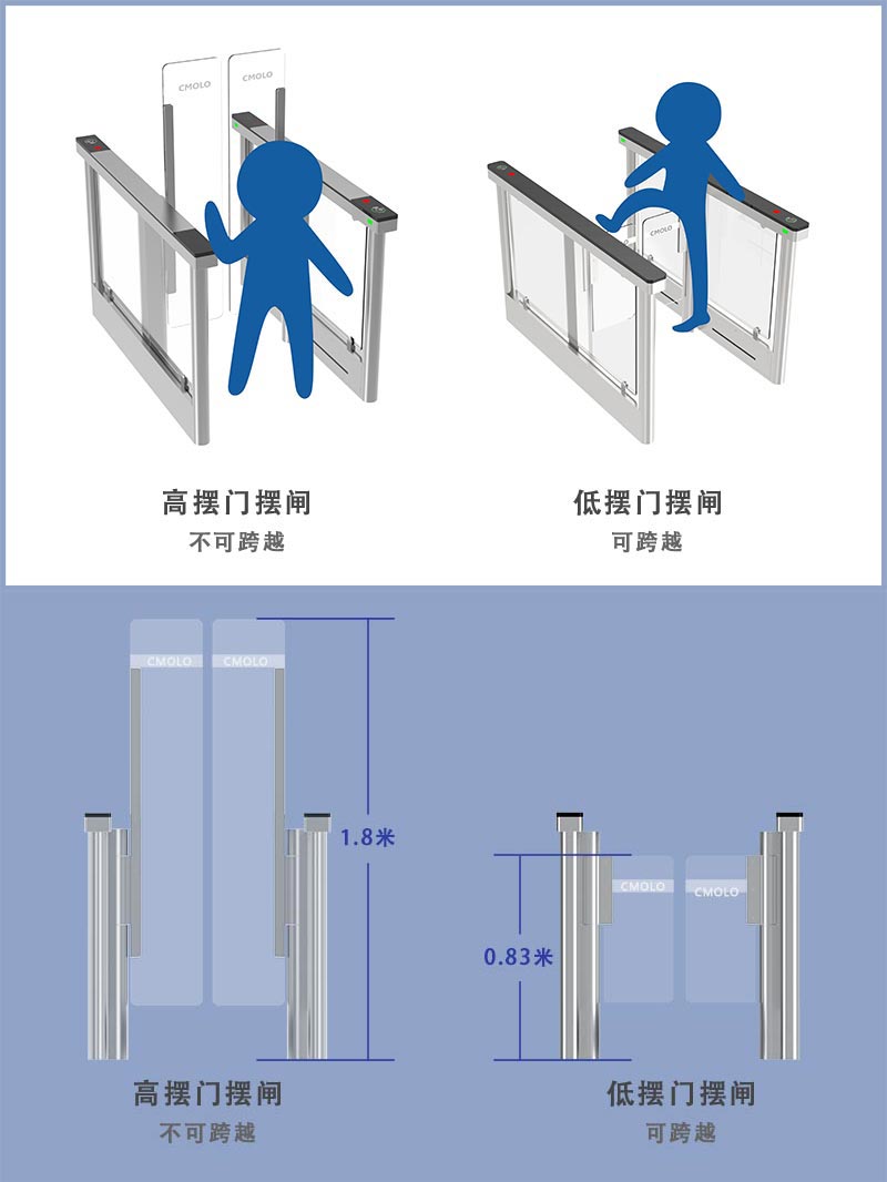 常规摆闸CPW-120Y的门摆离地常规高度一般为0.83米,行人容易从门摆上方跨越过去。